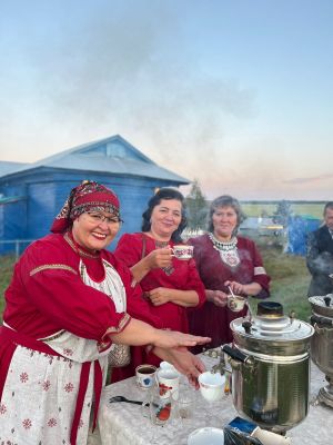 На празднике День села в деревне Владимирово всеобщее внимание привлекли троюродные сестры – Альбина, Лидия и Венера, которые блистали в потрясающих национальных костюмах, сиявших всеми красками под летним солнцем.
