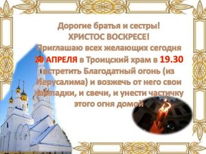 Сегодня, 20 апреля, в 19:30, в Троицком храме состоится торжественная встреча Благодатного огня, доставленного из Иерусалима.