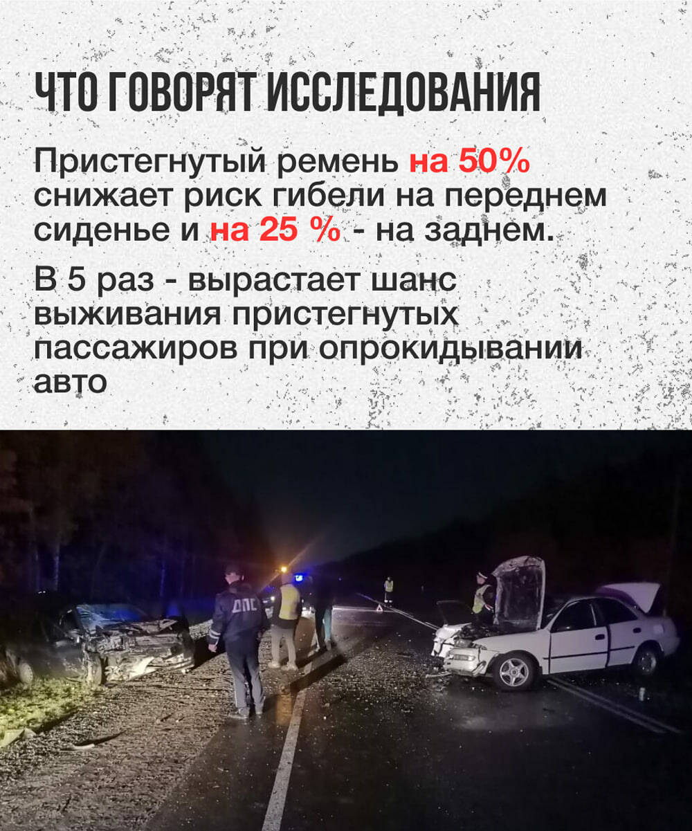 В Госавтоинспекции напоминают: когда ремень безопасности пристегнут, шансы выжить в аварии увеличиваются на 50 процентов для тех, кто находится на переднем сиденье, и на 25 процентов для тех, кто сидит сзади. В пять раз выше вероятность уцелеть во время опрокидывания автомобиля, если ремень был пристегнут.