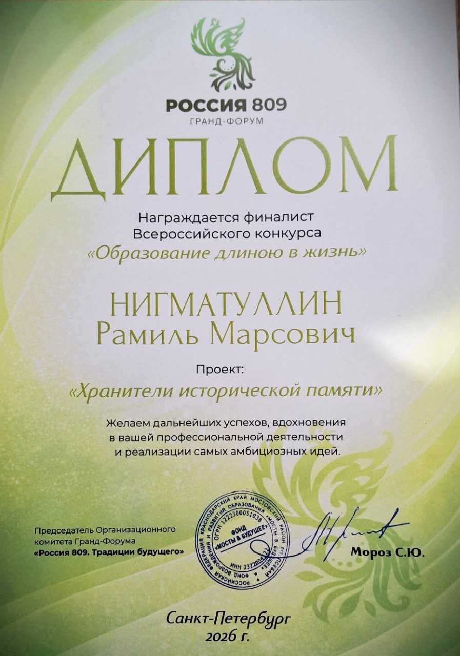 На суд экспертов и жюри Рамиль Нигматуллин представил свой авторский проект — «Международный краеведческий социально-образовательный культурно-просветительский проект «Хранители исторической памяти». Работа была высоко оценена специалистами и вошла в число 25 лучших конкурсных проектов.