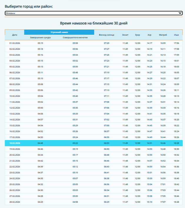 Расписание сухура и ифтара для Мамадышского района на февраль 2026