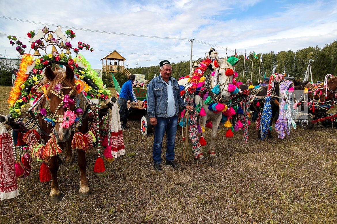 Первый конкурс праздника – на самую красивую упряжку. Каждая повозка украшена оригинально, сразу видно – владельцы старались, приложили все усилия и фантазию. У Халиля Хасанова из деревни Курса Почмак Арского района «патриотичная» повозка – с флагами Татарстана и России. В руках мужчины – самовар. Халиль Хасанов – учитель физкультуры, но всю жизнь держал лошадей. В течение 27 лет он каждый год выезжает на Сабантуй на своей повозке.
