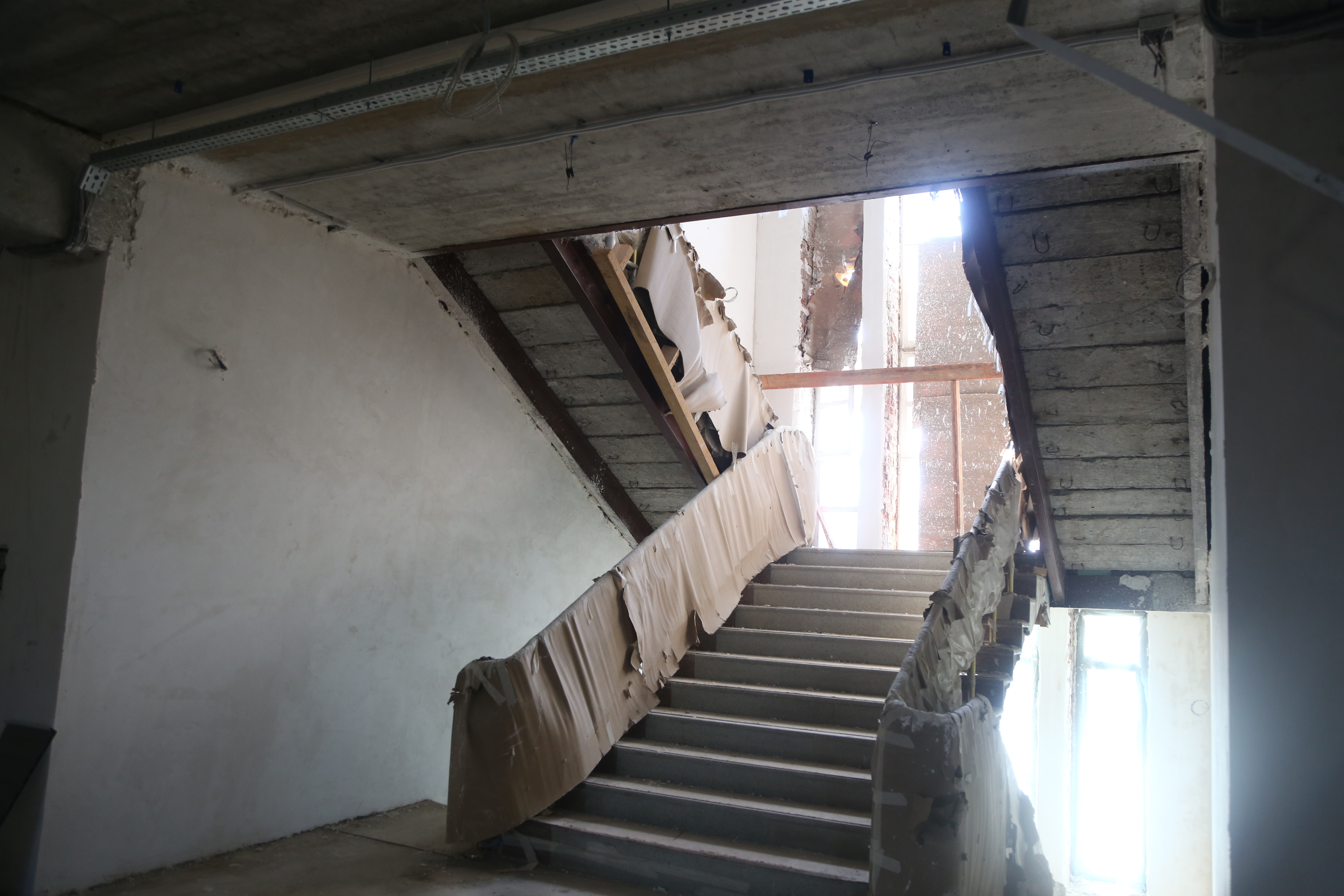 - Площадь некоторых кабинетов была увеличена, из-за чего некоторые помещения, соответсвенно, были уменьшены. Круглые залы не трогали, их площади останутся прежними. Стены будут облицованы декоративным, шумопоглощающим материалом. Для полов будем использовать керамические плитки, линолеум, паркет. Потолки, лестницы и подлокотники также будут выполнены из современных стройматериалов. Ремонтными работами занимаются 32 человека. Все они из Казани. График работы – 6/1.