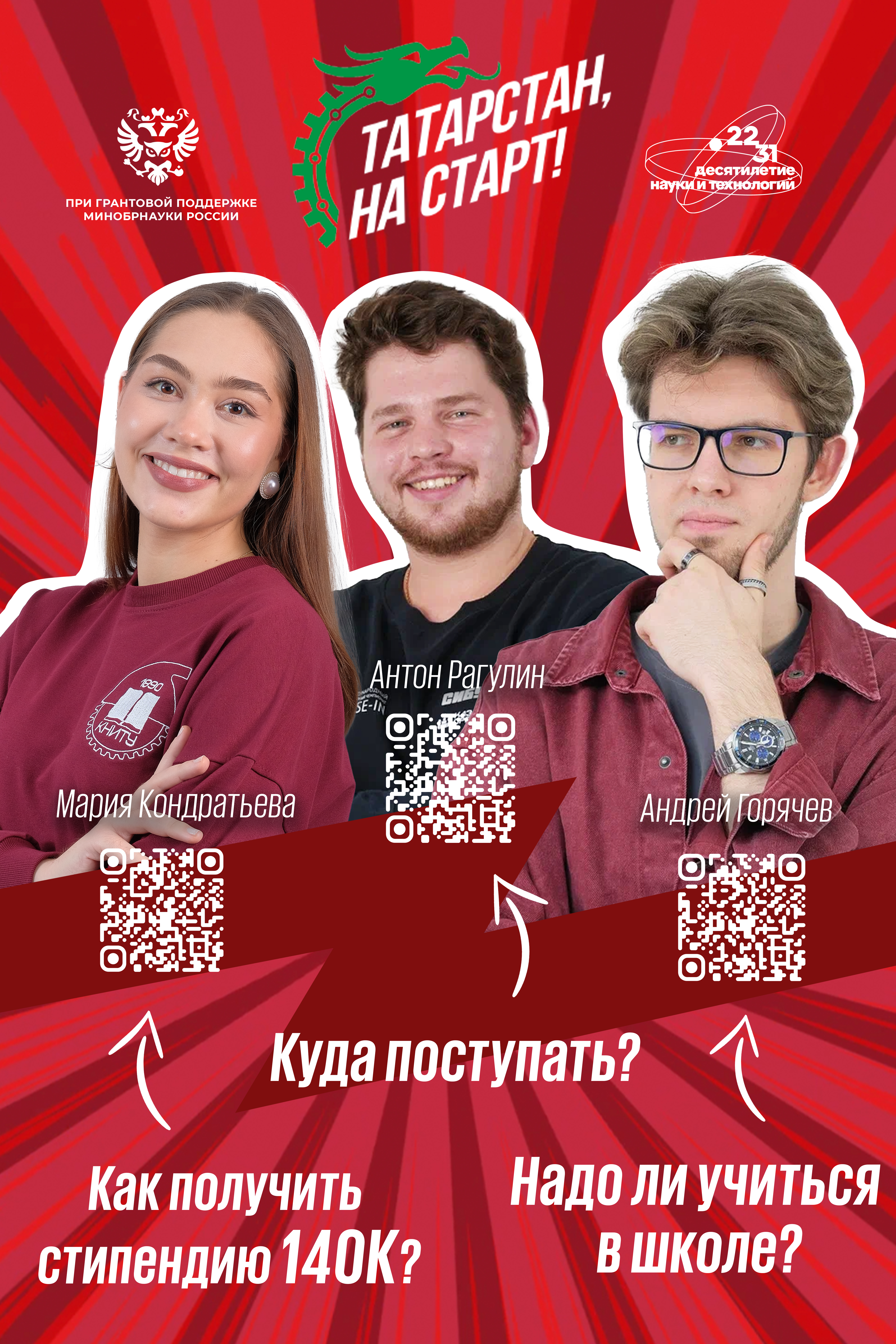 Героями видеопроекта «Татарстан, на старт!» стали молодые учёные и технологические предприниматели — студенты и аспиранты ведущих инженерных вузов Казани (КНИТУ-КХТИ, КАИ и КГЭУ). Их выбор определяли успехи в бизнесе высоких технологий. Свои стартапы герои роликов реализуют в разных сферах. Это полимеры и битумы, пищевые и биотехнологии, создание новых приборов, механизмов и обучающих программ. При этом каждый из героев, несмотря на молодость, — уже состоявшаяся личность со своими убеждениями, достижениями и ценным жизненным опытом, за плечами которой — множество побед в конкурсах молодежных проектов.